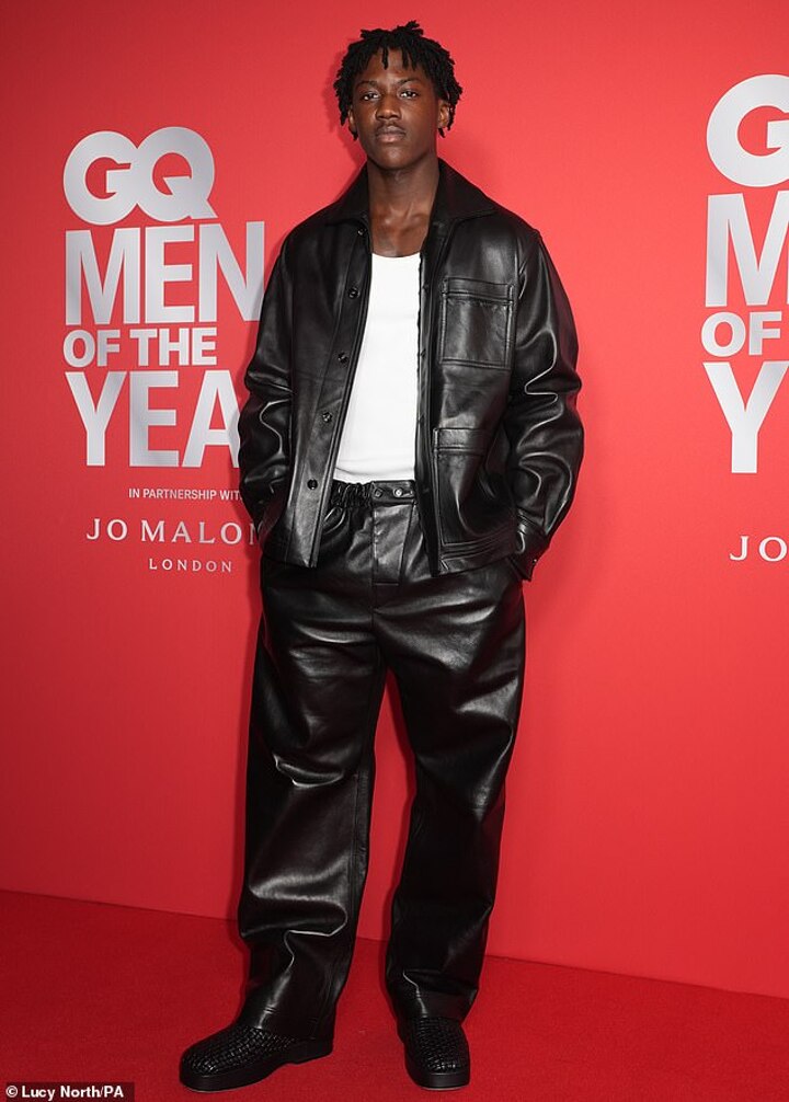 Mainoo rocked a black leather jacket and trousers with a simple white T-shirt to boot.