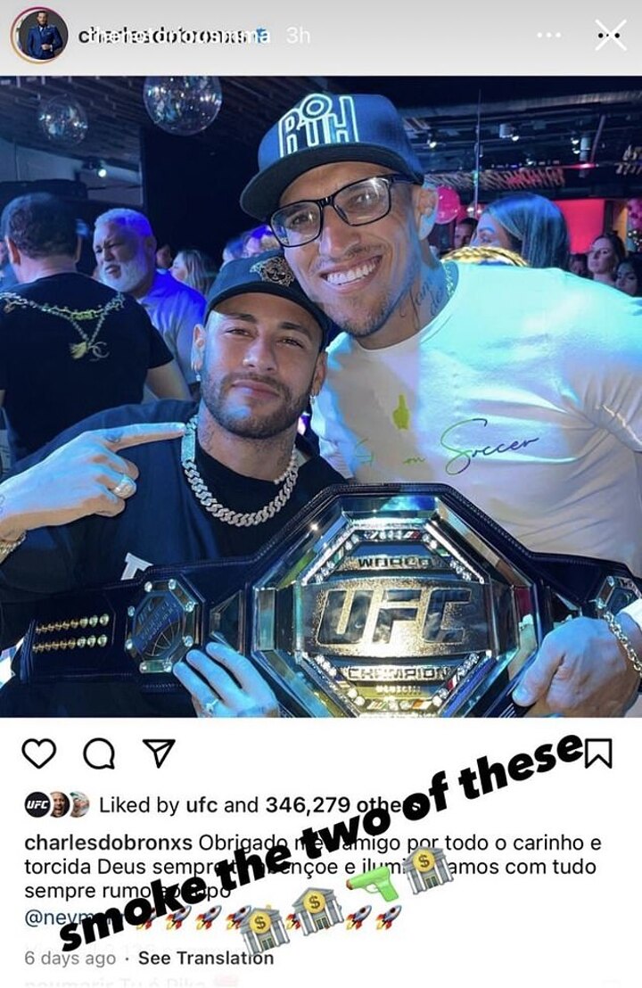 Neymar and Oliveira met at an event last week, with the PSG player smiling next to the lightweight king and pointing at him as they held his belt in a photo posted on the UFC man's Instagram account.