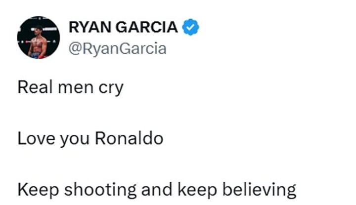 Suspended boxer Ryan Garcia who is serving a year-long suspension after testing positive during a drugs test similarly sent a message of support to Ronaldo, posting on X: 'Real men cry. Love you Ronaldo. Keep shooting and keep believing.'