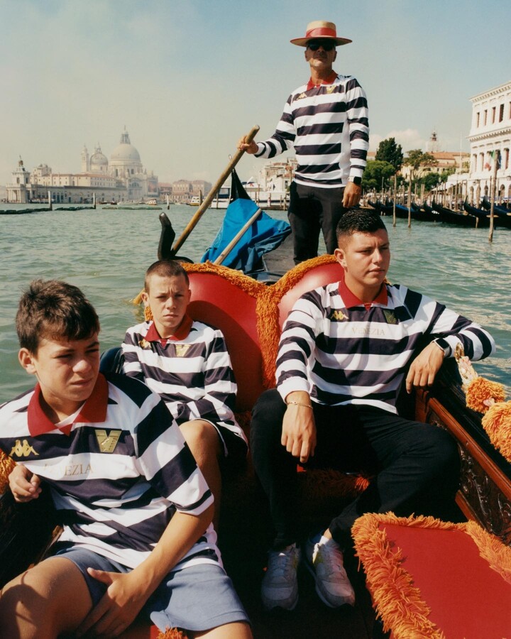 Third: The third kit is perhaps the most noteworthy as it is inspired directly by the famous striped uniforms worn by the gondoliers who navigate the canals of Venice. The black-and-white bars are topped off with an exquisite red fold-over collar. In fact, all that's missing is the traditional straw boater hat.