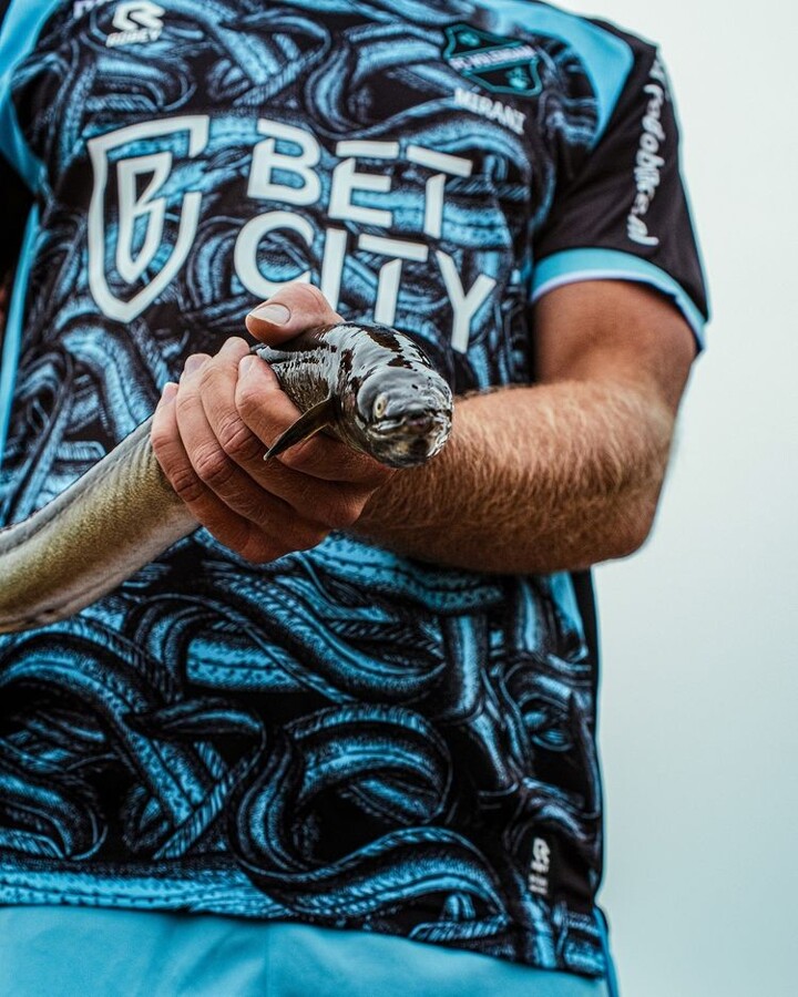 Away: With all taste and decency heaved well and truly out of the window, Dutch club Volendam have covered their garish 2023-24 away shirt in eels. Yes -- eels. Neon blue eels. The slippery strip has been dubbed the "Palingshirt" ("Eel Kit") and also features a small embroidered image of one of the many statues of fishermen that are situated along the city's harbour.