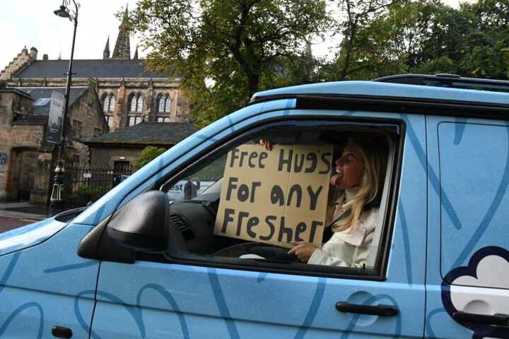While in the passenger seat, the adult performer held up a sign which read: "Free hugs for any fresher".