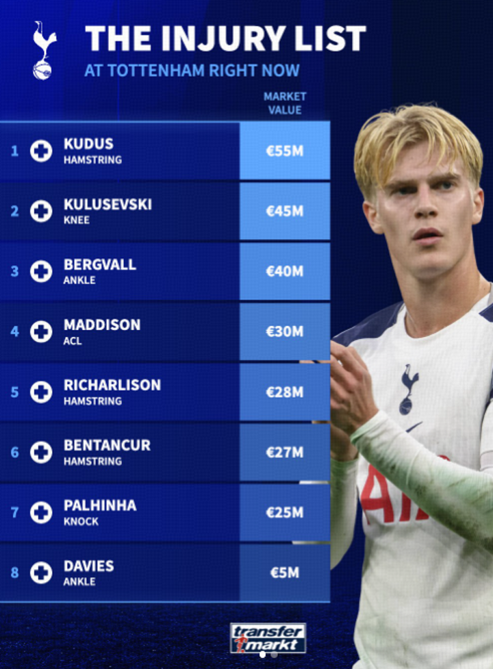 On January 22, Transfermarkt released Tottenham Hotspur's injury list of eight players, whose combined market value exceeds €250 million.