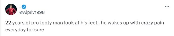 '22 years of pro footy man look at his feet.. he wakes up with crazy pain everyday for sure,' one fan wrote on X, formerly Twitter.