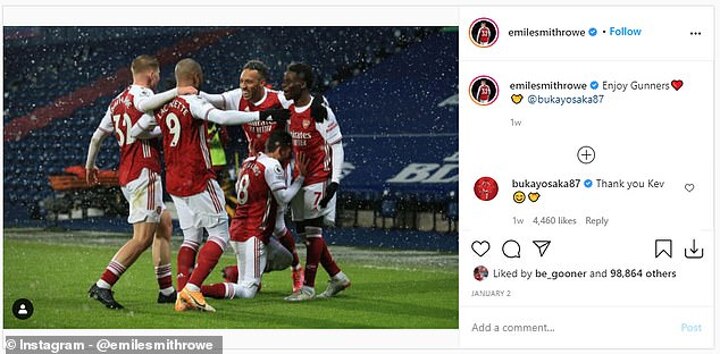 Smith Rowe is often referred to as the 'Croydon De Bruyne' at Arsenal, with fellow youngster Bukayo Saka the latest player to reference it by posting 'Thank you Kev' on Instagram after their win against West Brom.
