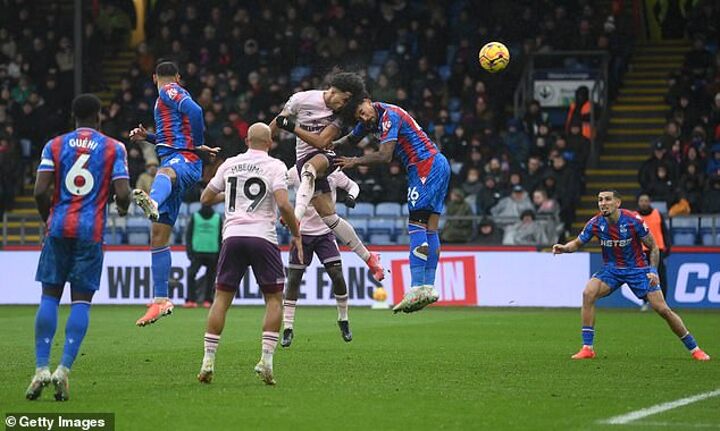 In the 56th minute, down went Eze and up went the yellow card for Vitaly Janelt as Palace won a wide 25-yard free-kick. Eze took it, a deflection from Sepp Van Den Berg in the wall sending it crashing into the post.