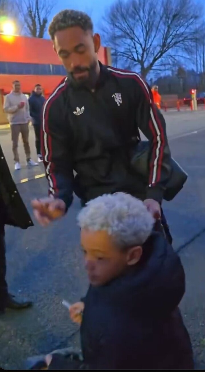 After the match, Cunha patiently signed autographs for the waiting Manchester United fans outside Old Trafford, even having his son help him.