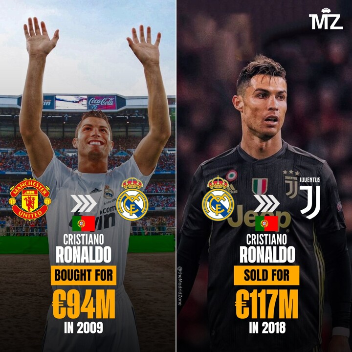 Real Madrid signed Cristiano Ronaldo at 24 for €94m who went onto have 581 goal contributions in 438 games, won 16 trophies (4 CL), 4 Ballon D’Ors, 3 Golden Boots & then he left at 33 for €117m. Is this the best transfer in football history? YOU BET IT IS.[100percent]✅️