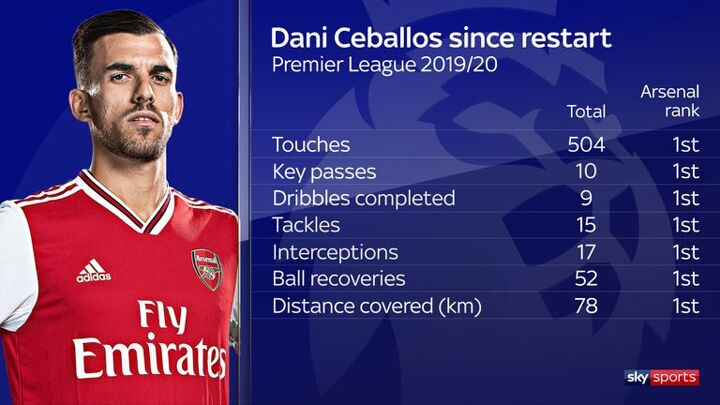 As well as creating more chances and completing more dribbles than any of his Arsenal team-mates since the restart, Ceballos ranks top for both tackles and interceptions. He has even covered the most ground. "I'm really happy with the way he is evolving," said Arteta recently.