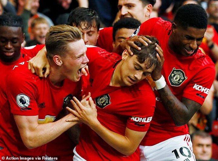 Daniel James launched into an emotional celebration at Old Trafford when he scored just seven minutes after coming on as substitute on his competitive debut for Manchester United.