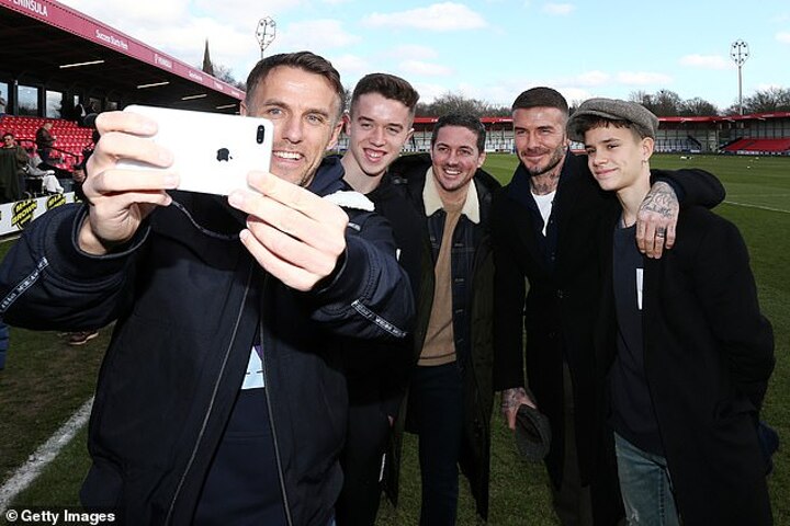 Beckham was accompanied by his son Romeo and close friend Dave Gardner and met up with Phil Neville, who was with his son Harvey.