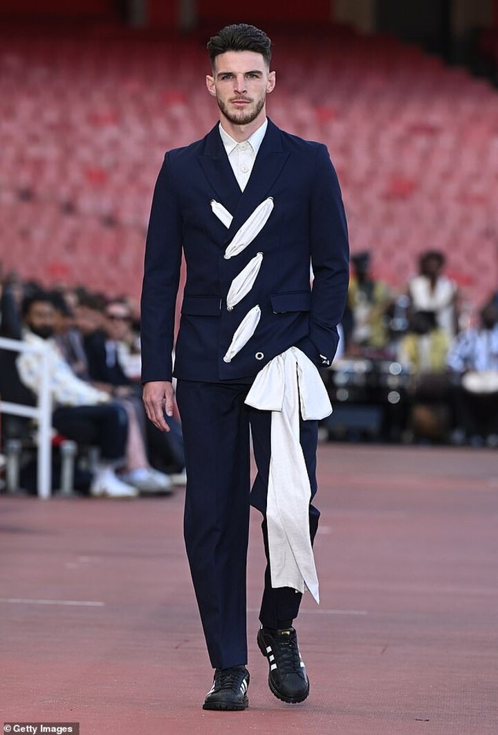 Declan Rice cut a dapper figure in a quirky navy suit as he walked the Labrum runway show during London Fashion Week at The Emirates Stadium on Monday.