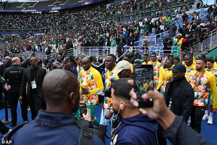 Senegal continued to protest the stripping of their Africa Cup of Nations title as they paraded the trophy around the Stade de France before their latest international match.