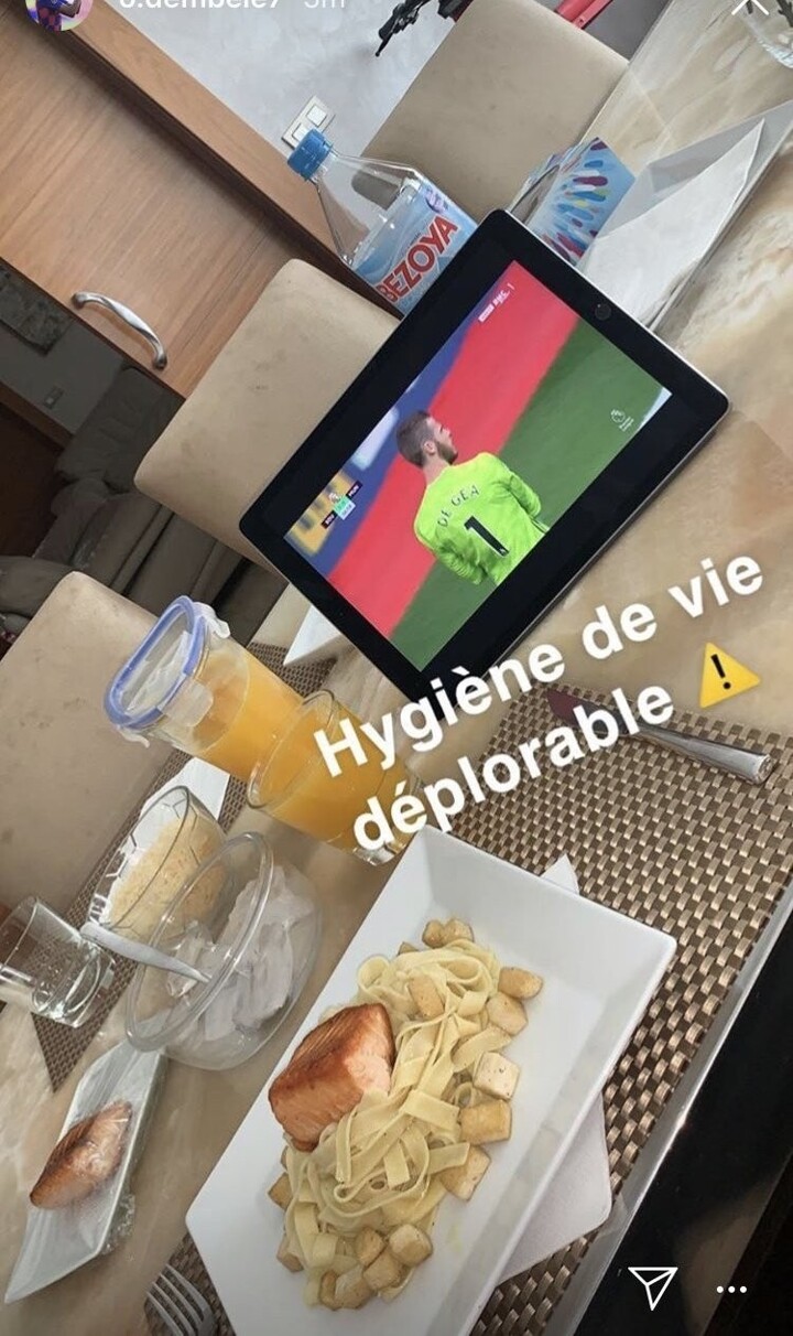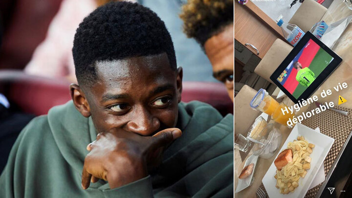 "Deplorable lifestyle," Dembele wrote on his Instagram story over a photo of his lunch, which consisted of pasta with salmon, orange juice and water.