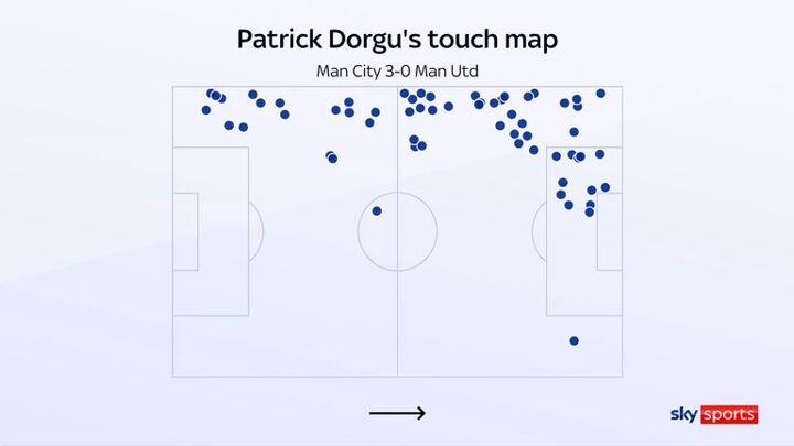The United player to have found themselves in the most one-on-one situations is Dorgu. If that is the plan with Amorim's 3-4-3 then it is a concern because on Sunday that is probably the United player Pep Guardiola would have wanted to have the space.