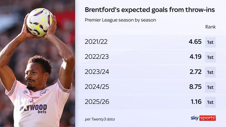 "It is not new to us," said Brentford boss Keith Andrews. How true. Over the past five seasons, their expected-goals tally from throw-ins is 21.47. The next best in the Premier League in that period is just 5.49 by Nottingham Forest. The rest are playing catch up.