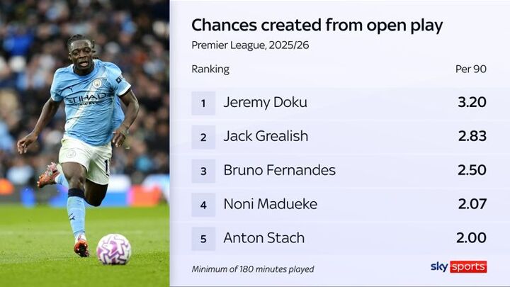 Grealish, who had a season-high 16 touches in the opposition box in Everton's goalless draw with Aston Villa, still ranks second for chances created from open play in the Premier League so far this season, but the one man ahead of him on that list is Doku.