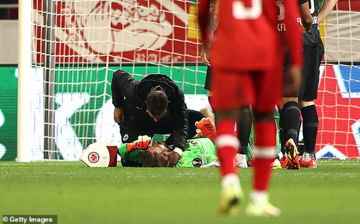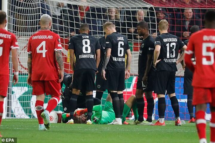 Eintracht Frankfurt goalkeeper Kevin Trapp received medical attention after a firework thrown at him from the grandstands exploded just inches away from his feet.