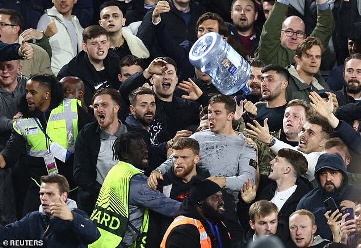 Both sets of supporters were seen throwing objects at each other, including a giant bottled water cooler, while Aaron Cresswell had objects thrown at him when he took a corner late on in the first half.