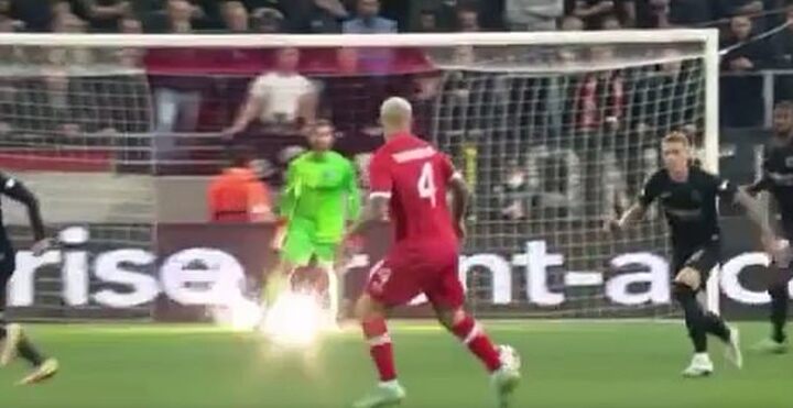 The Frankfurt keeper was then took by surprise as the pyrotechnic looked to spark just inches away from his feet.