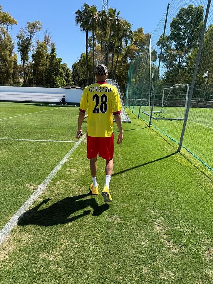 Photos showed Ekitike training at the Marbella Football Centre, understood to be last month, with the forward seen wearing a retro away kit from Liverpool 1997/98 season.