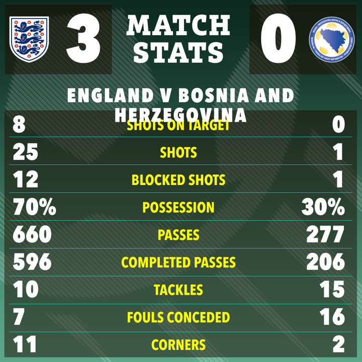 Game is over and the final score is England 3-0 Bosnia-Herzegovina. Here is the match report.