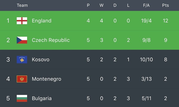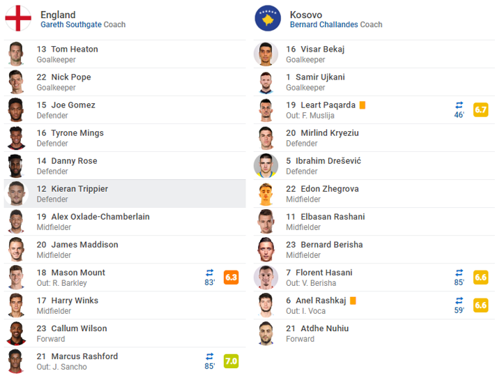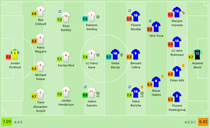Aliti goes down with an injury on the left flank, but England continue their attack down the right flank. Sancho probes down the wing before firing a low ball into the middle. Vojvoda steers it into his own net by sticking out a left boot.