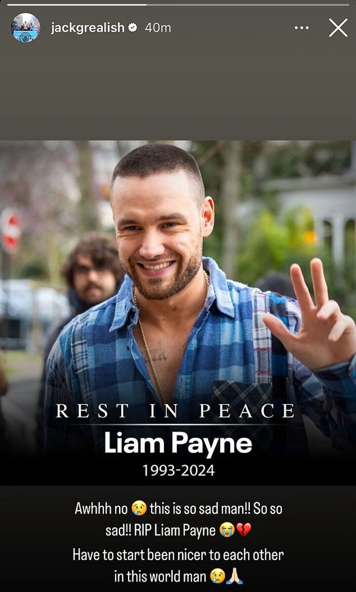 Manchester City star Jack Grealish has paid tribute to Liam Payne after the former One Direction star died aged 31 on Wednesday night.