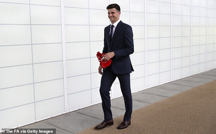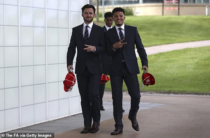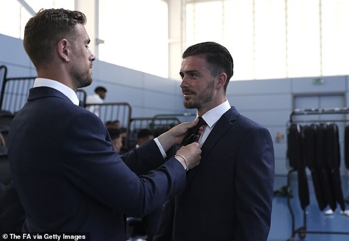 Players were in good spirits with Jordan Henderson agiving Jack Grealish a helping hand with his tie. The squad were also handed their official caps for the pictures at St George's Park.