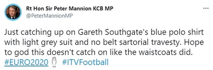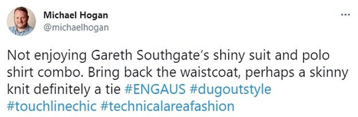 'Just catching up on Gareth Southgate's blue polo shirt with light grey suit and no belt sartorial travesty. Hope to gof this doesn't catch on like the waistcoats did,' one fan said.