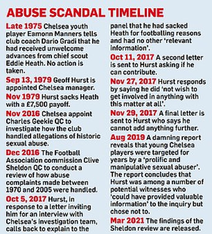 Clive Sheldon QC published his long-awaited four-year investigation into sexual abuse in football between 1970 to 2005 and pointedly drew attention to the fact that England's World Cup hat-trick hero had declined to be formally interviewed by Chelsea's own inquiry into sexual abuse crimes committed by Eddie Heath, a chief scout sacked by Hurst in 1979, during his time as Chelsea manager.