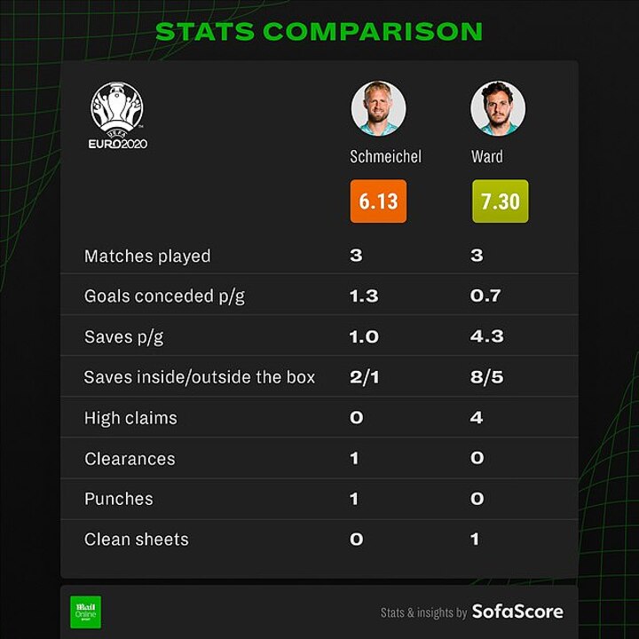 Many people's pick of the tournament's keepers to date, Ward statistics in comparison to Denmark keeper Schmeichel's at the tournament - provided by Sofascore - demonstrate the extent to which he has justified his selection over Wayne Hennessey since Wales' warm-up game against France.