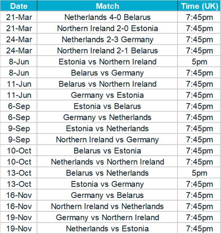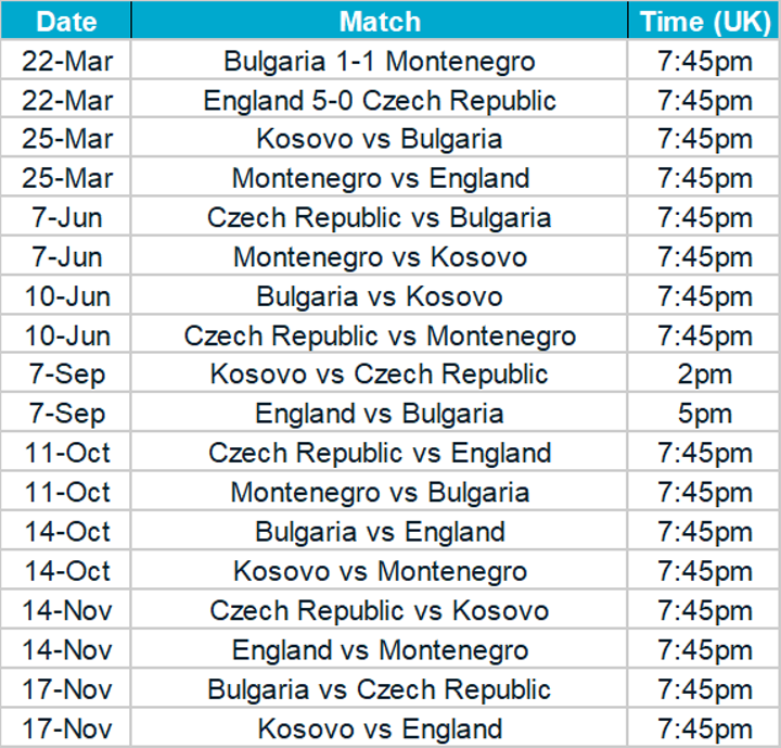 ITV will broadcast England qualifiers, while Sky Sports will broadcast the games of Scotland, Wales and Northern Ireland. S4C will cover Wales games live in Welsh.