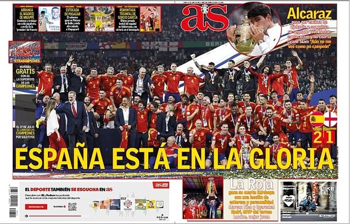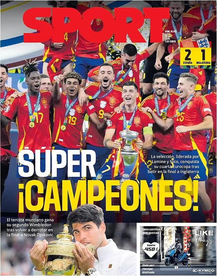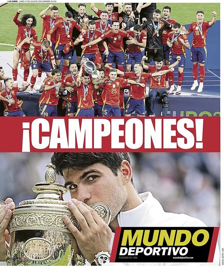 Sport used their front page to salute the achievements of both their football team and Carlos Alcaraz, who defended his Wimbledon crown after beating Novak Djokovic in straight sets yesterday, hailing them as 'super champions'.