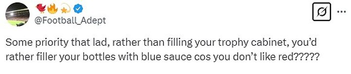 'Some priority that lad, rather than filling your trophy cabinet, you’d rather filler your bottles with blue sauce cos you don’t like red?????,' wrote another.