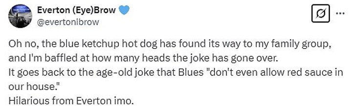 One Toffee wrote: 'Oh no, the blue ketchup hot dog has found its way to my family group, and I'm baffled at how many heads the joke has gone over. It goes back to the age-old joke that Blues "don't even allow red sauce in our house." Hilarious from Everton in my opinion.'
