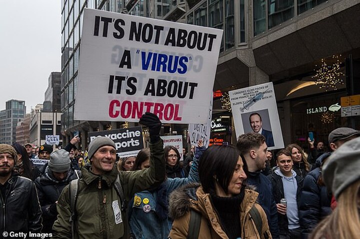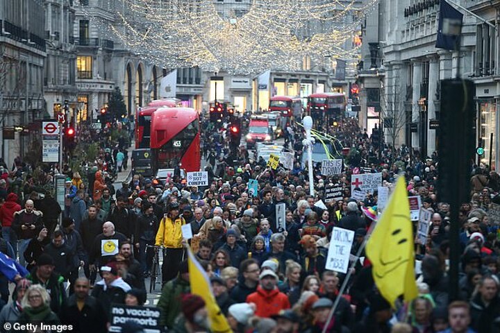 The demonstration, declared a 'major incident' by London mayor Sadiq Khan, was attended by thousands of anti-vaxxers after further restrictions were put in place to slow the spread of new coronavirus variant Omicron.