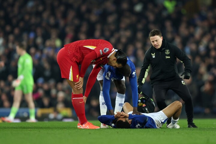 Team-mates Idrissa Gueye and Abdoulaye Doucoure, as well as Liverpool skipper Virgil van Dijk, rushed over to console him.