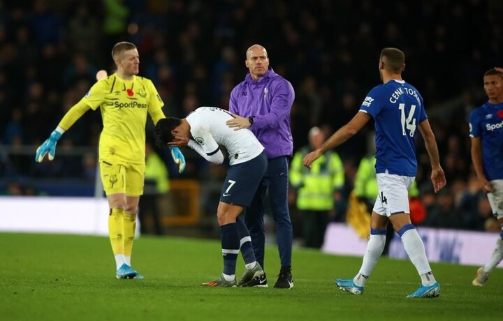 Son is absolutely distraught as he makes his way off the pitch, with other players visibly distressed.