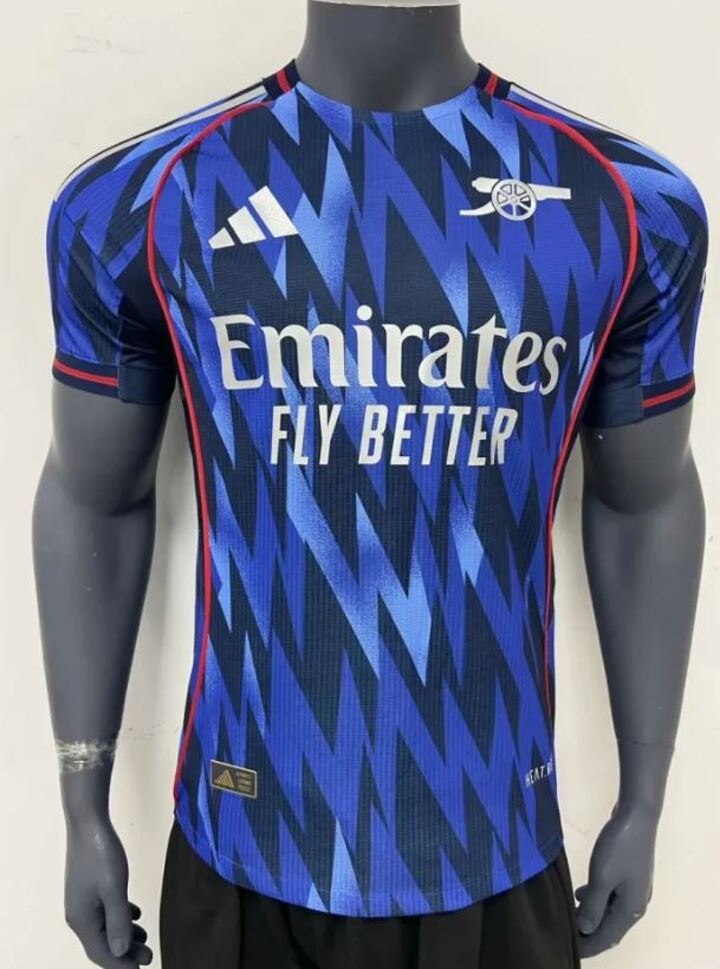 With a dark and light blue lightning-like pattern, the top has the Gunners' alternative cannon badge in white.