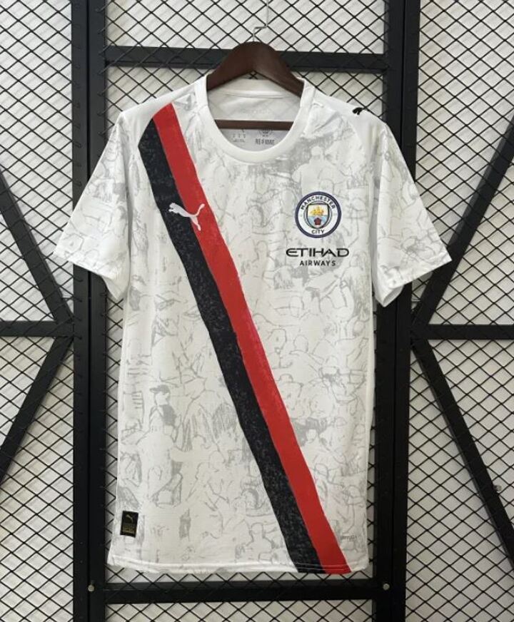 The white away shirt has outlines of City supporters doing the poznan, with a black and red diagonal strip covering the front.