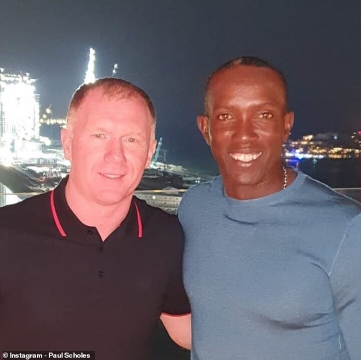 In the caption, Scholes had written: 'Now this is a centre forward, good to see you @officialdwightyorke19.'
