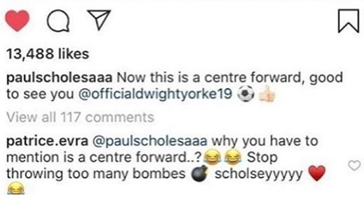 In response, Evra commented: 'Why you have to mention is a centre forward..? Stop throwing too many bombes, scholseyyyyy,' before adding a love heart emoji.