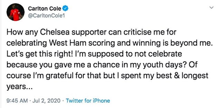 'How any Chelsea supporter can criticise me for celebrating West Ham scoring and winning is beyond me,' he wrote.
