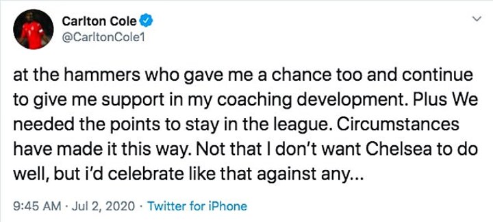 In a series of tweets, Cole admitted his surprise for coming under fire as he cheered the Hammers in the studio.