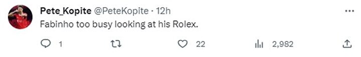 Fans took to Twitter to poke fun at the midfielder, with one saying 'Fabinho too busy looking at his Rolex', a reference to the glinting watch the midfielder was bizarrely recently given by an enthusiastic fan.
