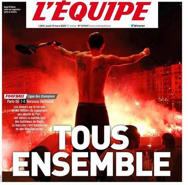 'Tous Ensemble' (All Together) was the headline on the front page of L'Equipe that featured a stunning photo of Di Maria, standing with his arms outstretched, towering above a mass of fire and flags.