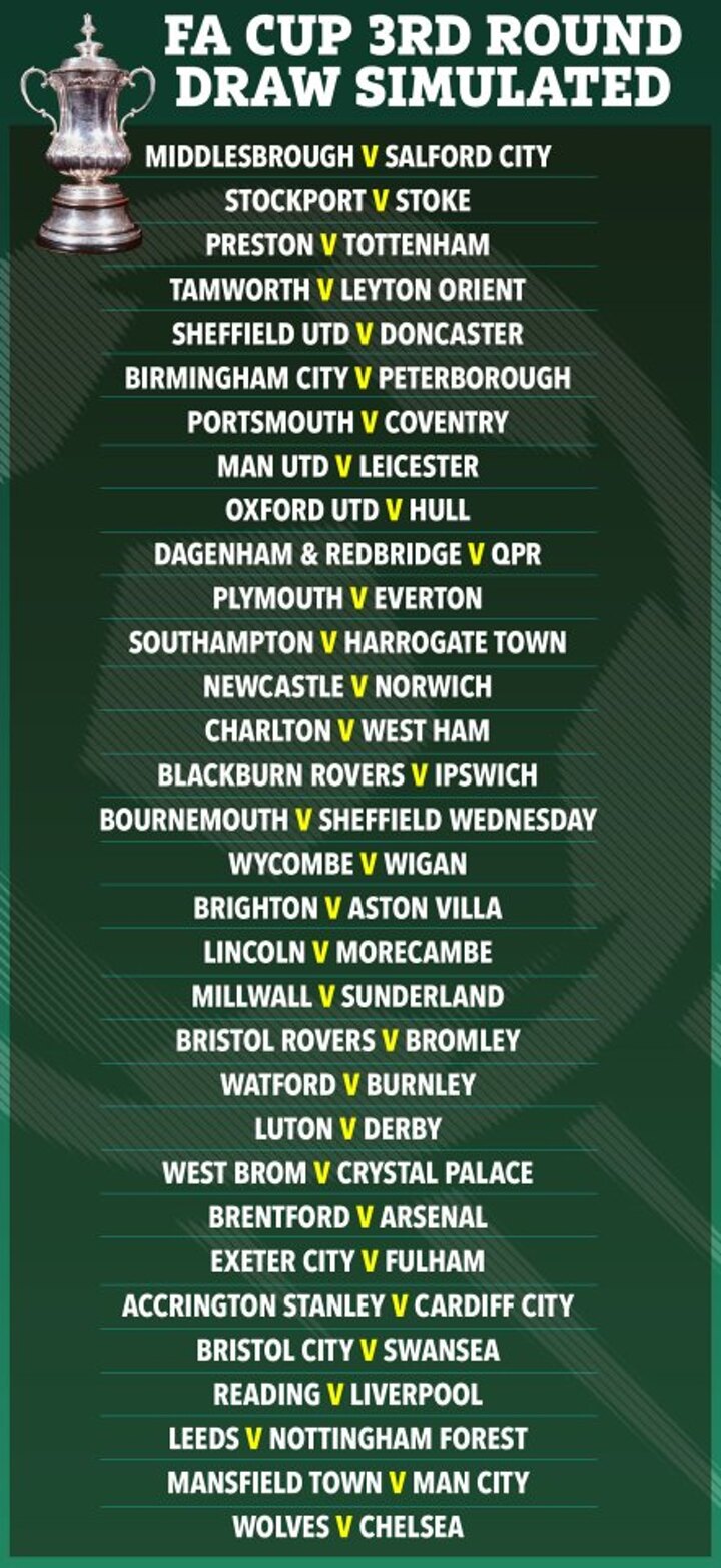 Meanwhile, last season's runners ups Man City will play Mansfield Town, according to our calculations.