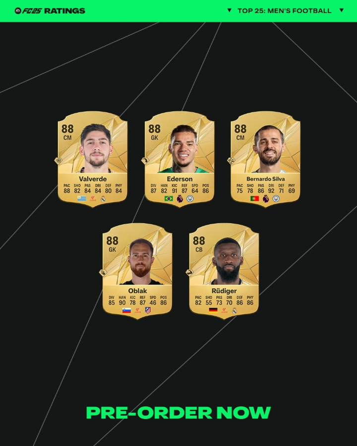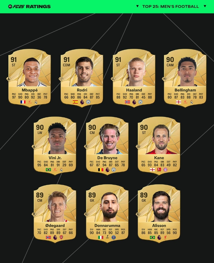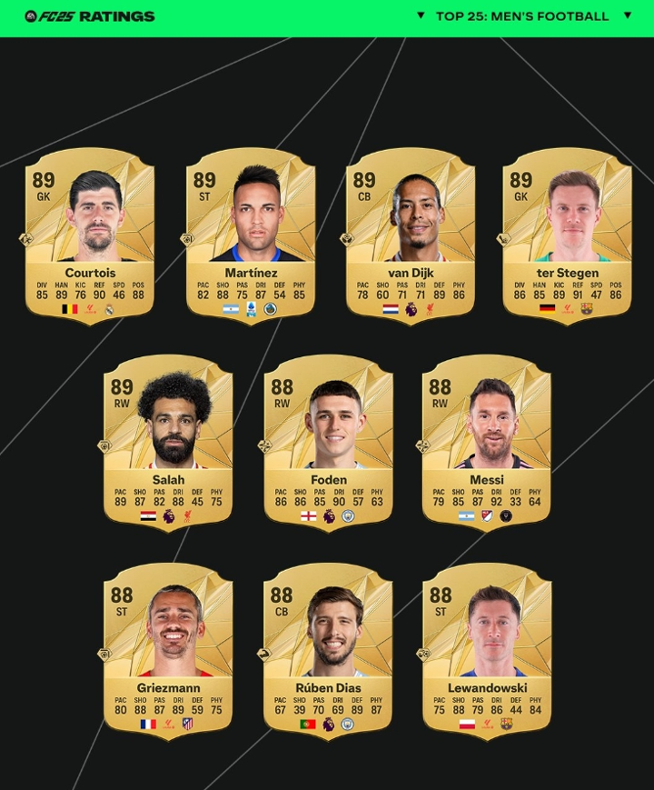 Here are the top 25 men's players' ratings on EA FC 25 Ultimate Team, as confirmed by a post from the official EA Sports FC Twitter account: