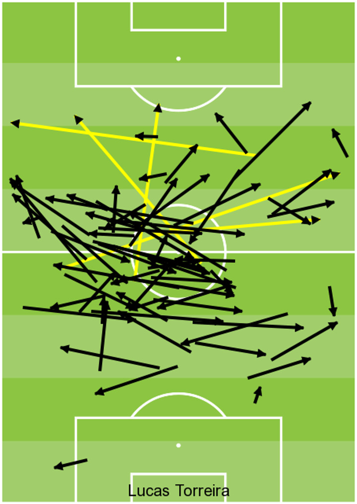 The graphic below shows the Uruguay international's completed (black) and failed (yellow) passes against Palace. Torreira completed just six passes in the final third, and yet the one time he did venture forward it led directly to the Arsenal equaliser. Early in the second half he received the ball in the number 10 space and flicked it out wide, setting up an attack and sending a ripple of applause through the crowd. Spurred on, within seconds Torreira won a free-kick deep in the Palace half and Granit Xhaka fired Emery’s side level.